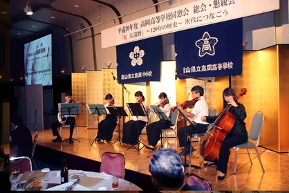 さて、8月16日当日は大雨の影響が懸念されましたが、ホテルニューオータニ高岡に総勢398名の出席をいただき、大盛況となりました。そして、同窓会の目玉であるアトラクションの弦楽演奏、学校の歴史を振り返るスライドに対して、多くの方々に興味を持っていただいたものと考えています。ただ、少しざわついた中での演奏、ナレーションが聞こえにくかった、スライドが見えにくいテーブルがあったとの意見もいただき、もう少し工夫の必要があったと反省しています。